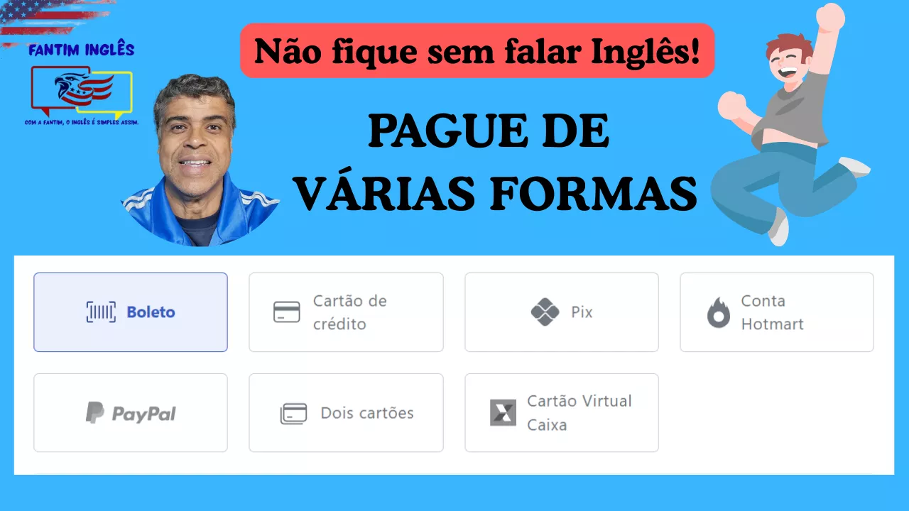 Aprenda inglês de forma leve, prática e com foco total na conversação! Seja bem-vindo(a) ao Fantim Inglês, o curso que nasceu para transformar o seu jeito de aprender inglês. Aqui você vai aprender a se comunicar de verdade, mesmo que esteja começando do zero — sem fórmulas mágicas e sem enrolação. O que você vai encontrar no Fantim Inglês? Módulos passo a passo, do básico ao avançado. Aulas 100% práticas, com foco na fala e compreensão. Vocabulário real, usado no dia a dia e em viagens. Gramática aplicada, só o que realmente importa. Exercícios com correção, para fixar o conteúdo. Simulados, desafios e prática com diálogos reais. Curso 100% online e acessível pela Hotmart. Aulas gravadas disponíveis 24h por dia. Material complementar em PDF. Suporte para dúvidas e orientação de estudos. Comunidade exclusiva de alunos. Certificado ao final. Bônus Exclusivos: E-book "100 Palavras-Chave para Destravar Seu Inglês". Plano de estudos personalizado. Aulas extras com dicas de filmes, músicas e séries. Grupo no WhatsApp para prática diária. Garantia de 7 dias. Você pode testar o Fantim Inglês sem compromisso. Se em até 7 dias achar que não é para você, devolvemos 100% do valor investido.